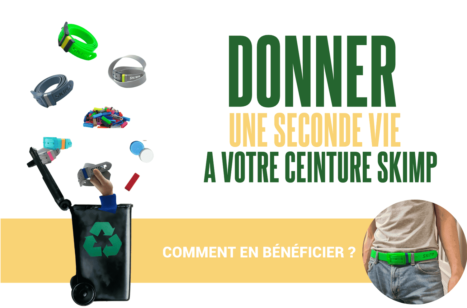 SKIMP vous rappelle que toutes nos ceintures sont 100% recyclables. En collaboration avec une usine partenaire, nous vous donnons l'opportunité de donner une seconde vie à vos ceinture abimées ou devenues trop courtes.