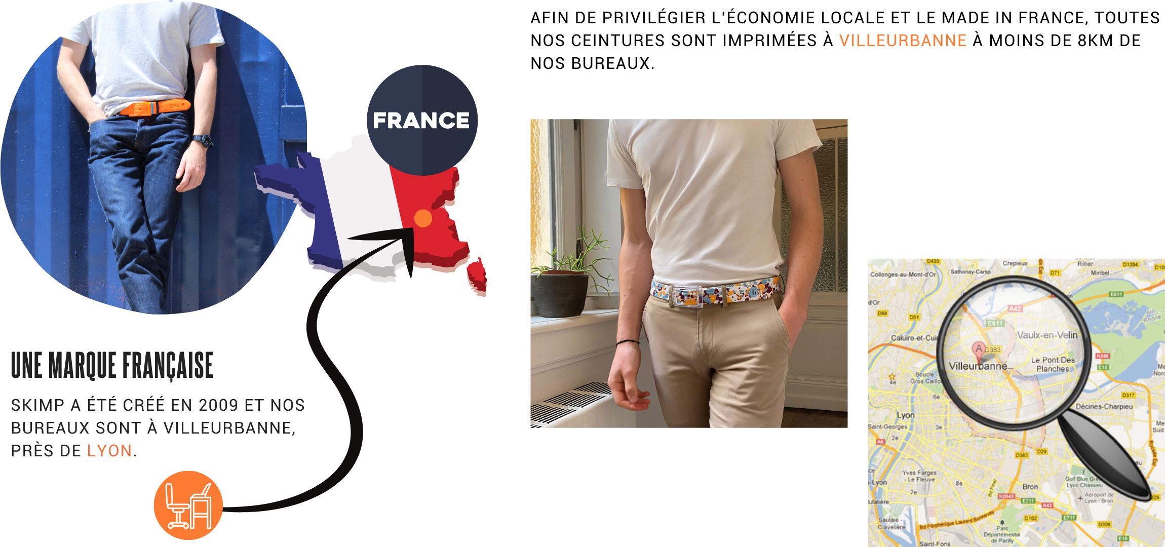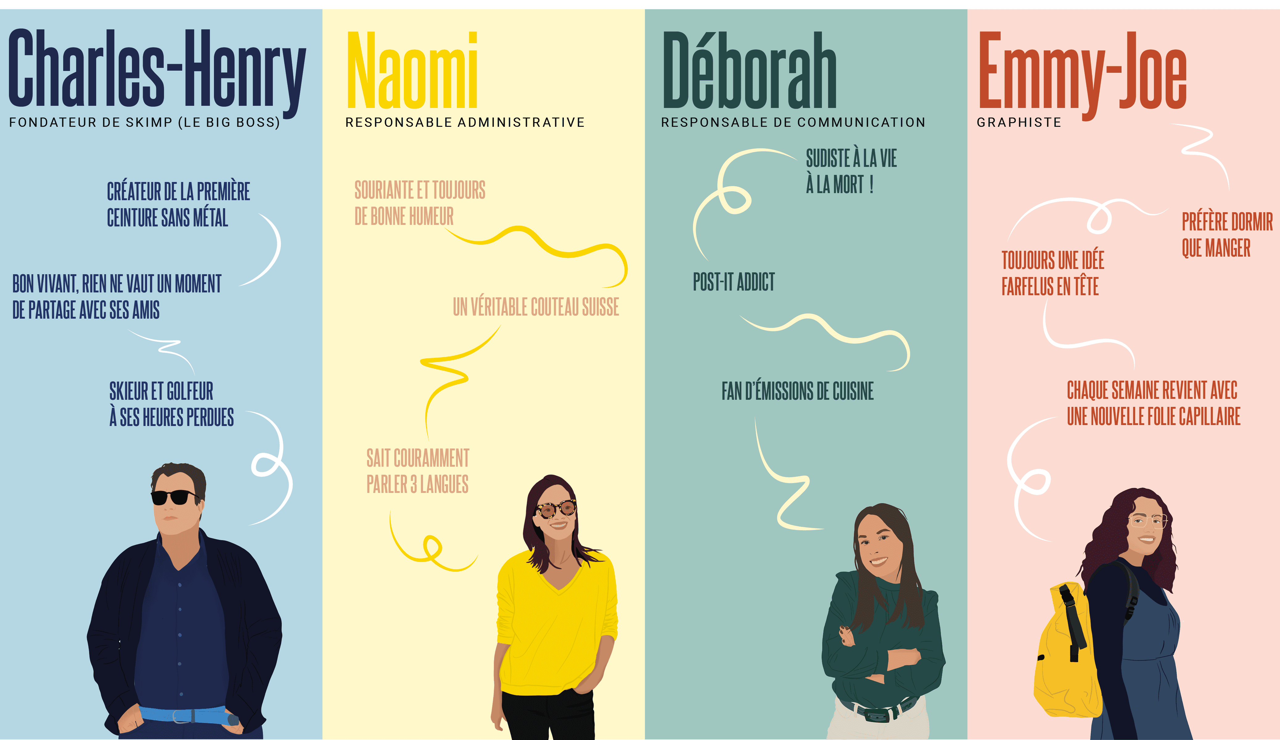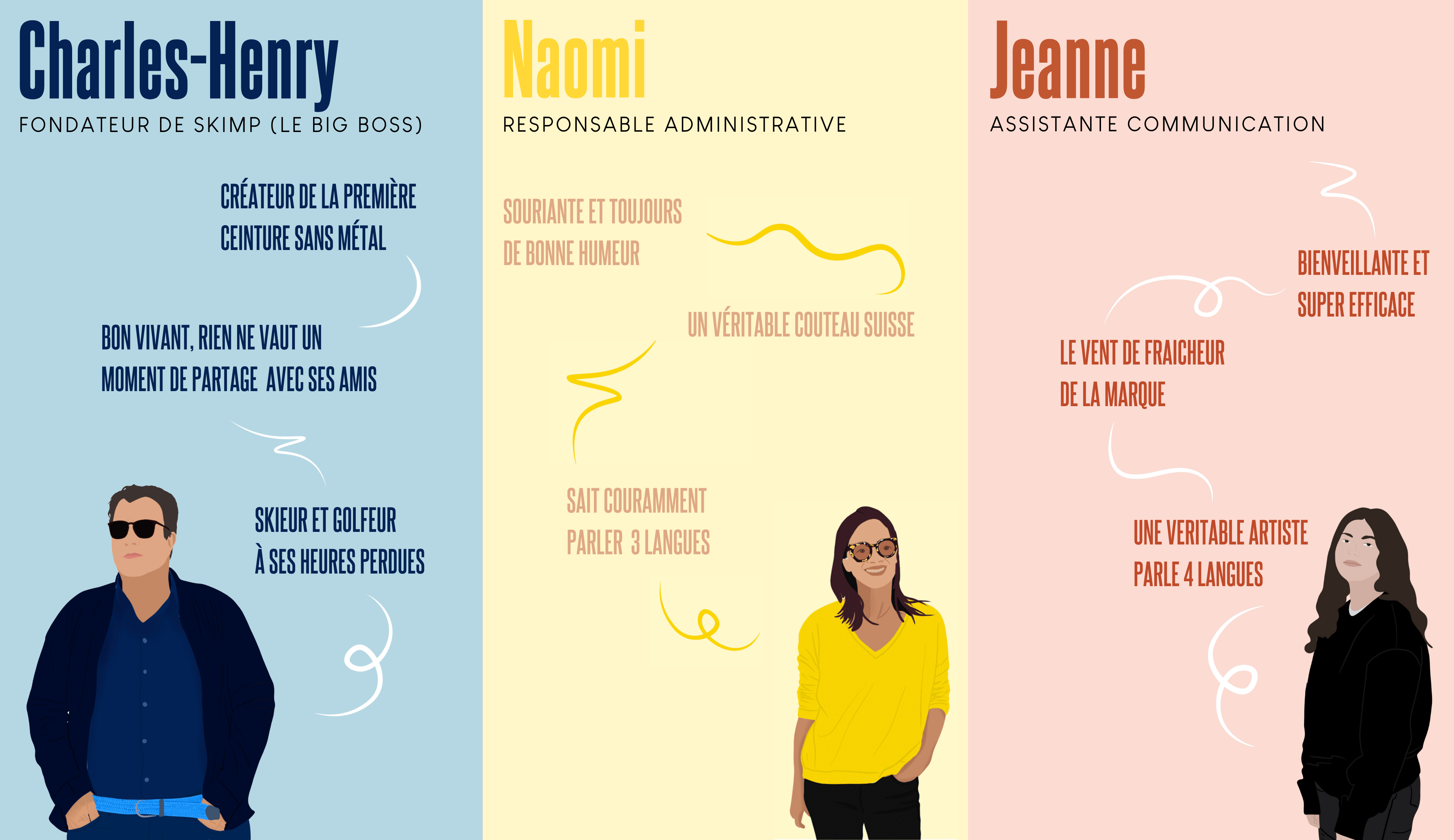 "La veille de mon départ pour un voyage d’affaires au Japon, j’ai décidé de porter ma superbe ceinture que je venais de recevoir pour mon anniversaire. Le jour J, lors d’une correspondance très courte à Francfort et d’un énième contrôle de sécurité, j’ai dû encore une fois tout enlever : chaussures, montre, ceinture. Étant à 5 minutes de la fin de l’embarquement et paniquant à l’idée de rater mon vol, j’en ai totalement oublié ma fameuse ceinture dans le bac du poste de contrôle… Dégoûté au fond de mon siège, l’idée d’une ceinture sans métal composée uniquement de matière plastique et adaptée aux voyageurs est apparue comme une évidence. Au-revoir les bips, le temps perdu à se rhabiller, bonjour les regards envieux des autres voyageur & le sourire amusé des contrôleurs. Et c’est ainsi que la CEINTURE SKIMP. La seule, l’unique, la vraie est née". Charles-Henry, le fondateur.